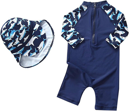 Baby Boys Kids Swimsuit One Piece Toddlers Zipper Bathing Suit Swimwear with Hat